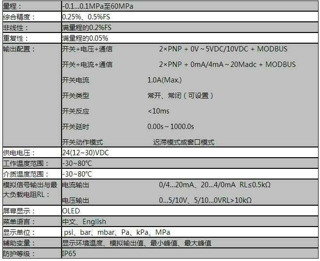 从 - 0.1 … 0.1MPa至60MPa,有多种测量范围可选。 另外还可提供绝压、表压、负压多种测量形式。零点可通过按键调整。 接触部件为圆形焊接密封不锈钢膜,无需内部密封件,适用范围非常广,甚至包括腐蚀性介质。多种过程连接可选。支持标准的MODBUS协议,可实现远程数据采集或参数设置,而无需购买额外的通信适配器。采用标准 M12x1 电气插头。设备设计紧凑,主体和过程连接之间可330°旋转,显示也可实现180°翻转,方便现场安装及监视。气体、液体压力测量。